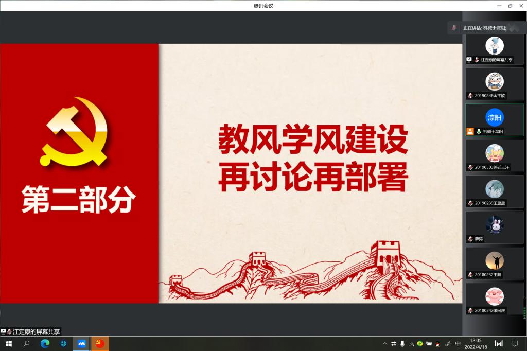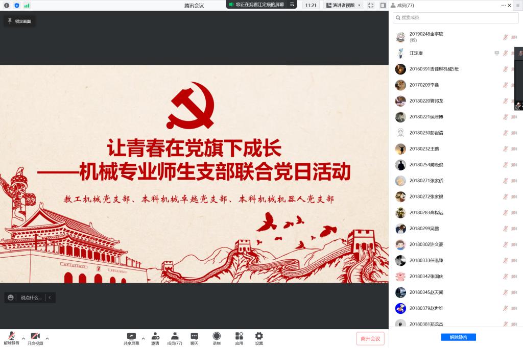为进一步贯彻落实学校“教风学风建设再讨论、再部署”工作安排,扎实推进“以党风带教风端学风”工作,进一步提升我院师生总体国家安全意识,发挥师生党员先锋模范作用。教工机械党支部、本科机械卓越党支部、本科机械机器人党支部于4月18日联合线上开展了“让青春在党旗下成长”主题党日活动,机械专业师生党支部全体党员和2022年发展对象参加了此次活动。