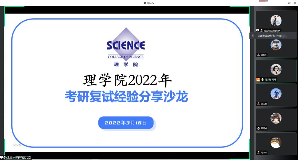 为积极推动理学院2022届毕业生助力服务工作,帮助我院考研学子顺利通过复试、取得研究生入学资格,3月16日晚,理学院开展线上考研复试经验分享沙龙,2021届优秀毕业生代表、2022年理学院考研学生参与了本次活动。