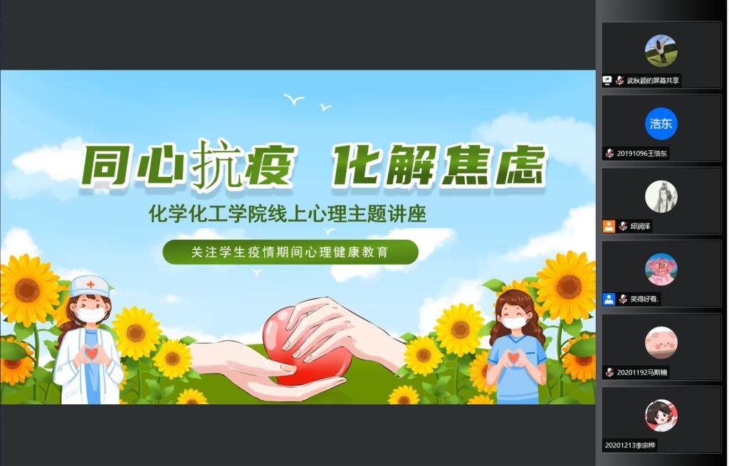 为做好抗击新冠肺炎疫情期间学生心理健康教育工作,全面提升疫情防控期间学生心理调适能力,根据学校《关于做好2022年春季开学学生心理健康教育的工作提醒》文件要求,化学化工学院于4月15日举办“同心抗疫,化解焦虑”线上心理主题讲座,学院各年级心理委员、宿舍心理联络员参与了此次活动。
