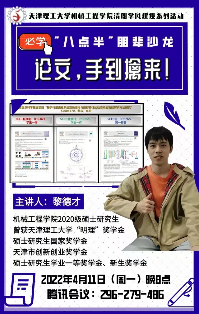 为贯彻落实学校清朗学风建设工程,发挥优秀研究生的朋辈模范引领作用,机械工程学院持续推进“八点半”朋辈辅导系列活动。4月10日晚,留校科研的2020级硕士研究生黎德才,针对留校学生及大四、研一学生分享撰写高质量论文方法与经验。