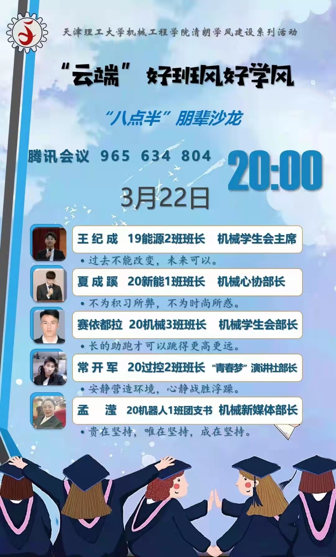 为积极推动清朗学风建设,充分挖掘朋辈资源,机械工程学院于3月22日晚开展“云端”好班风好学风——“八点半”朋辈沙龙,旨在通过沟通交流为班级建设与思想引领提供新办法。