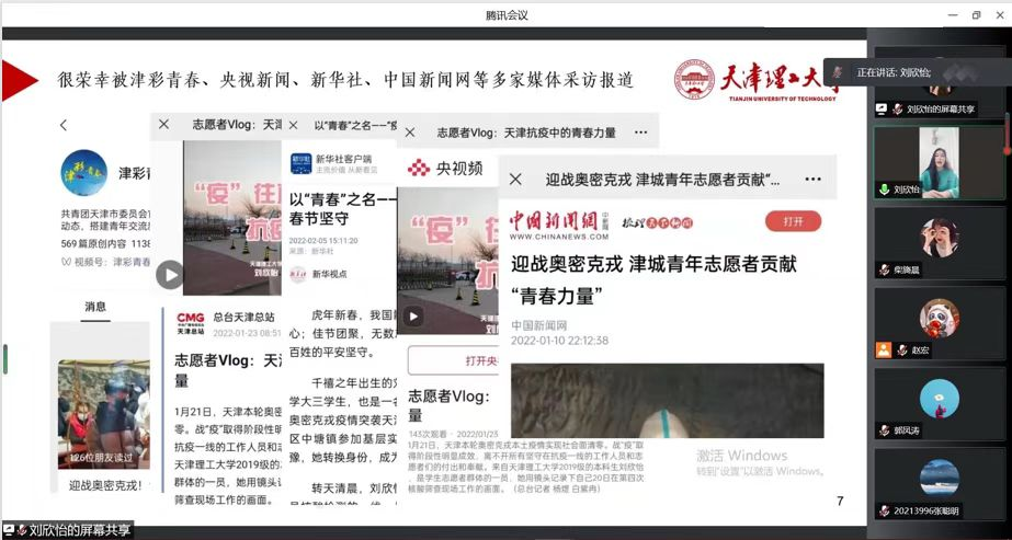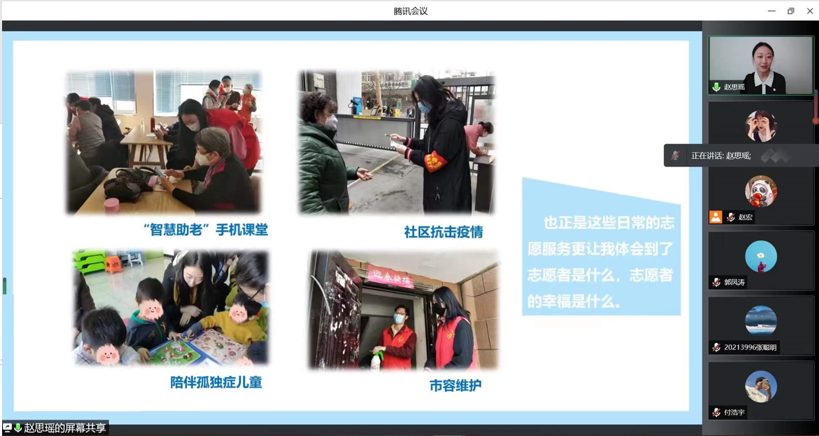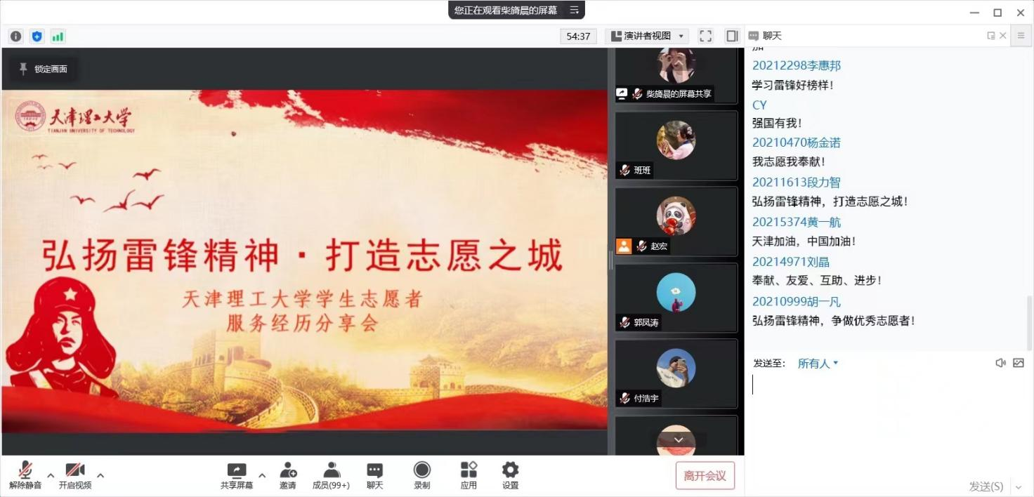 为大力弘扬“奉献、友爱、互助、进步”的志愿精神,引导青年用实际行动续写新时代雷锋故事,3月2日,我校开展“弘扬雷锋精神,打造志愿之城”学生志愿者服务经历分享会,邀请6名我校在各类志愿服务活动中表现优异的志愿者,面向300余名天理青年分享在疫情防控志愿服务、“一起云支教 共同迎冬奥”全国大学生2022寒假“返家乡”社会实践专项行动、“共同战‘疫’,后方有我”暖心专项行动等志愿服务活动中的个人经历。