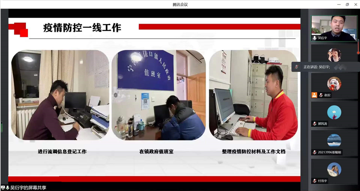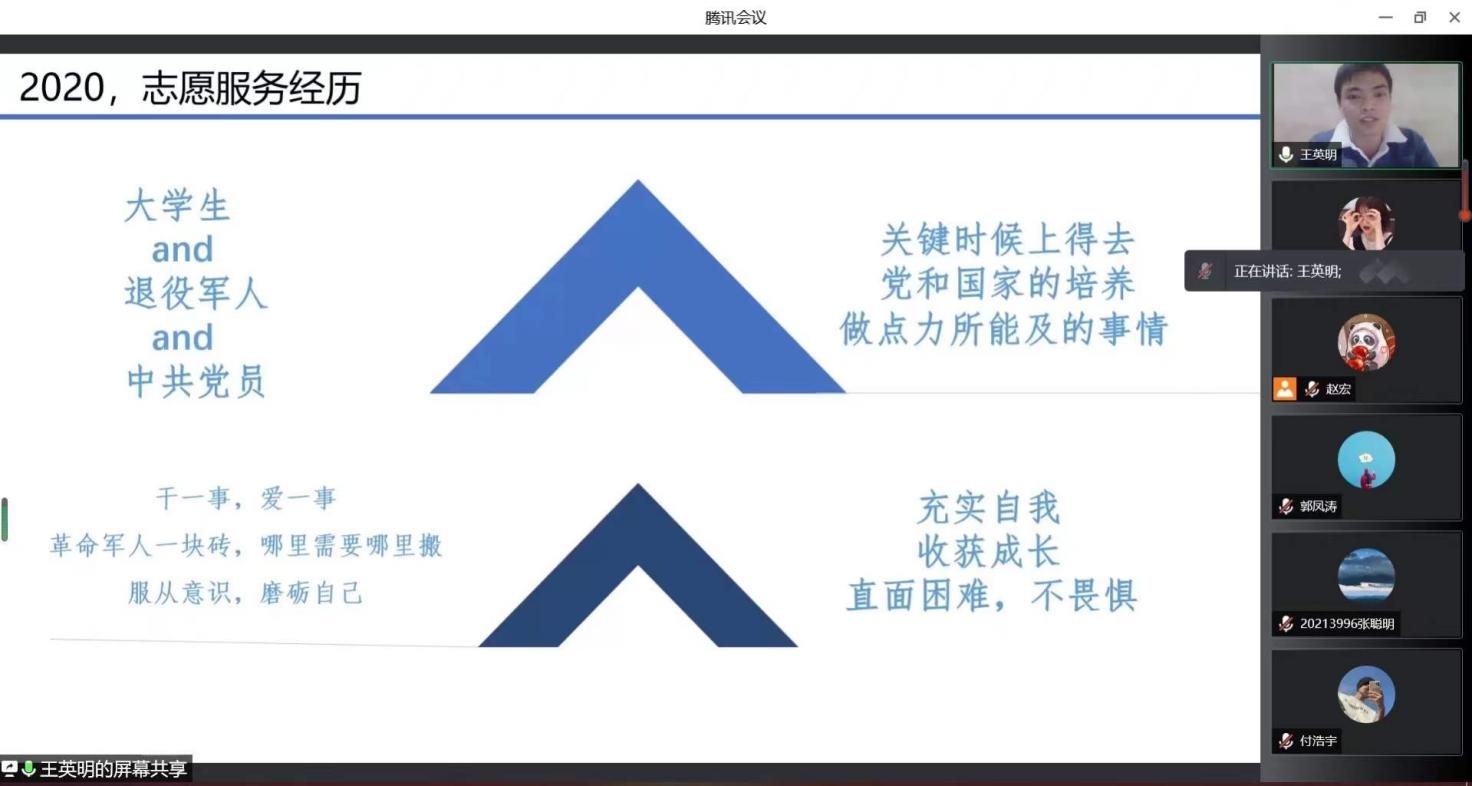 我校青马学员、海运学院2018级王英明与同学们分享了自己多次参与疫情防控志愿服务的经历。在这场没有硝烟的战斗中,作为退役大学生的他挺身而出主动应“战”,为坚决打赢疫情防控阻击战贡献青春力量,书写了新时代的“雷锋故事”。