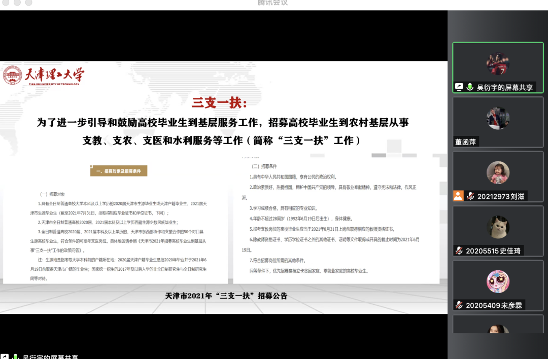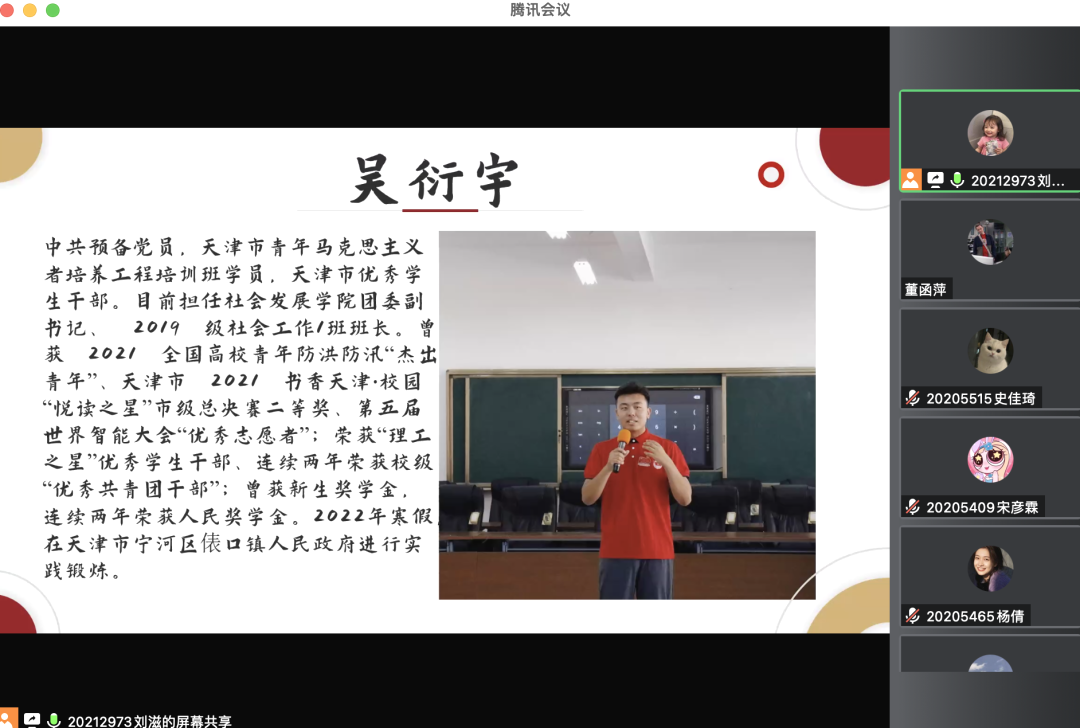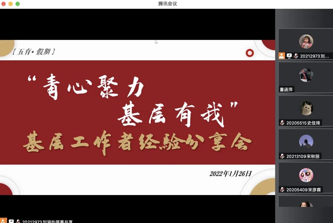 为促进学生对基层工作的了解和认识,提高学生的综合素质和社会责任感,进一步发挥青年力量,社会发展学院邀请吴衍宇同学采用线上会议的方式开展“青心聚力,基层有我”基层工作者经验分享会。