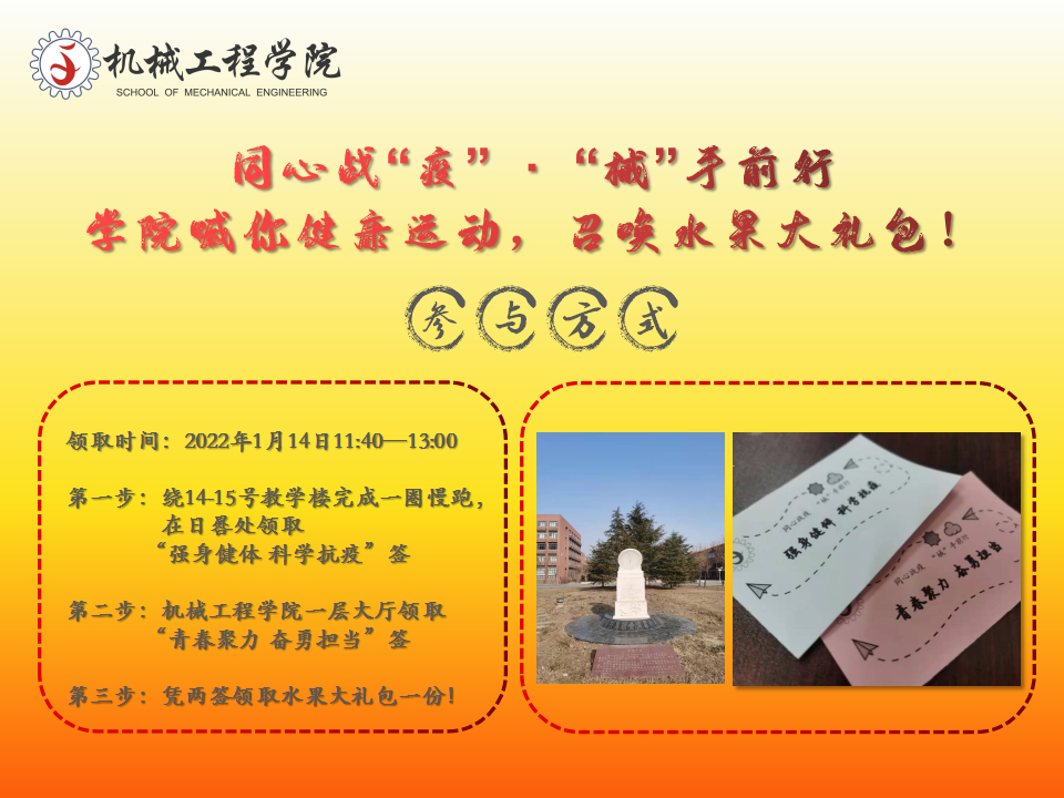 天津迎战奥密克戎,机械工程学院留校师生同心战“疫”,“械”手前行,积极响应天津市防疫政策,筑牢校园抗疫防线。1月14日,学院举办健步走活动,为在校学生发放爱心水果礼包,倡导同学们强身健体、科学抗疫。