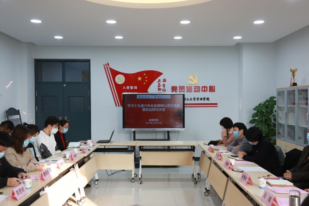 为深入学习贯彻党的十九届六中全会精神,扎实推进党史学习教育,结合“我为群众办实事”要求,服务学生发展,12月14日上午管理学院研究生党支部通过线上线下相结合的方式,联合举办“学习十九届六中全会精神心得交流会暨职业探讨沙龙”党日活动。校党委组织部、国有资产及校园经济管理处及学院相关负责同志出席,党员教师代表及辅导员代表参加。