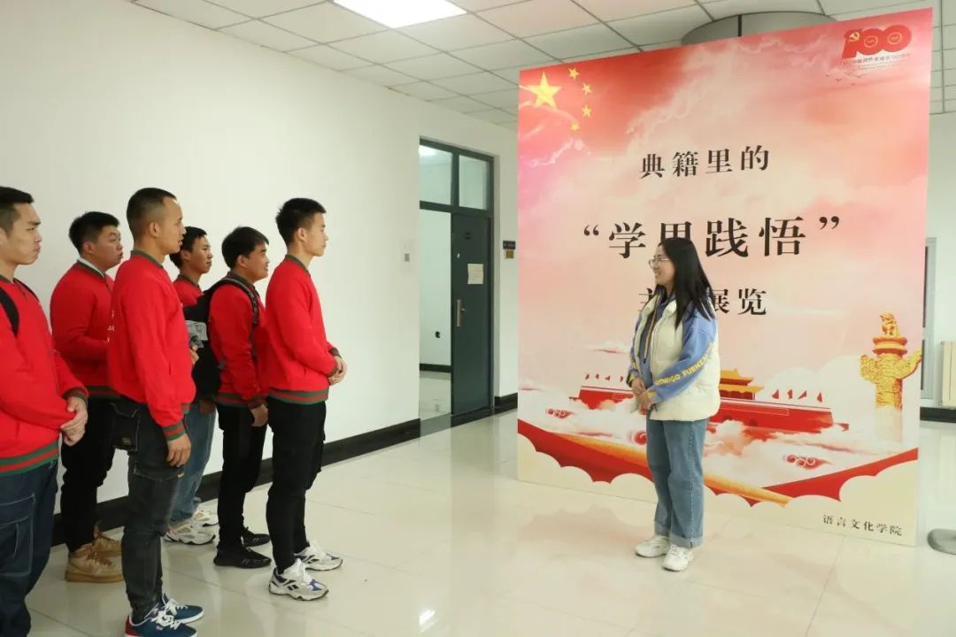 语言文化学院“典籍里的‘学思践悟’”主题展览现场,青马学员跟随讲解员走进中国传统文化,沉浸式感悟典籍里的文化精神,让学员们充分感受到了百年党史所带来的独特魅力。