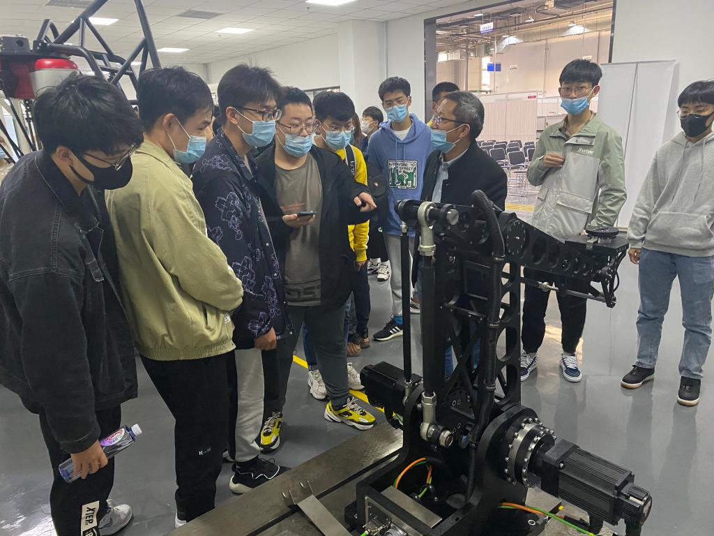 走访参观过程中,首先参观了设备间,并联机器人、串联机器人、机械臂等专业内容呈现眼前,学生们或交流机器人类型、或拍照记录型号;接着来到企业发展史展厅,了解该公司的发展历程及重大事项;最后,企业代表向同学们介绍了本公司在创新研发、紧追时代潮流过程中的艰苦奋斗历程,他说,“两弹一星”精神始终鼓舞着一代代科技工作者忠诚报国、矢志奋斗,同学们认真聆听,备受鼓舞。