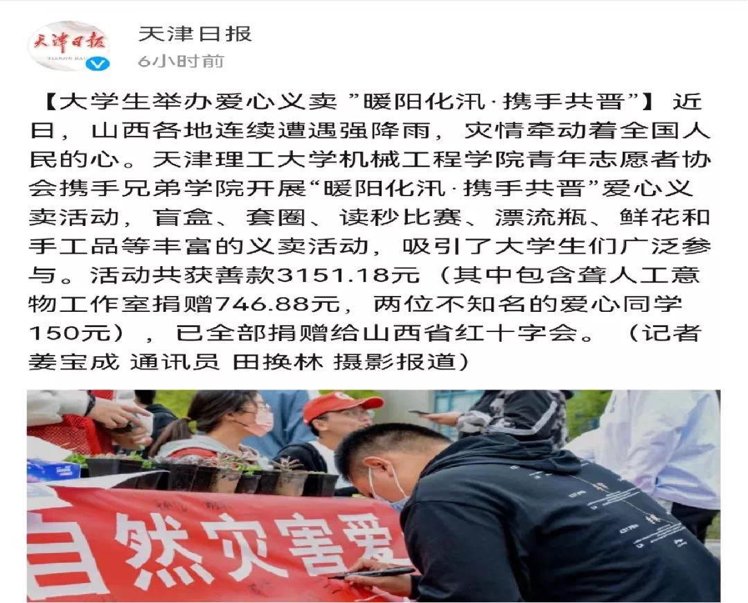 近日来,山西各地连续遭遇强降雨,洪水泛滥,灾情牵动着全国人民的心。机械工程学院青年志愿者协会携手兄弟学院开展“暖阳化汛·携手共晋”爱心义卖活动,活动所得善款均捐赠给山西省红十字会,用于援助山西同胞。