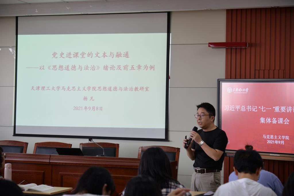 思修教研室教师杨凡以《党史进课堂的文本与融通》为题进行了分享。他表示,党史学习教育进课堂需要范畴论文本、方法论文本以及落脚点文本,并对三个重要文本的结构性涵义、三个重要文本之间的教材对接进行了系统阐述。