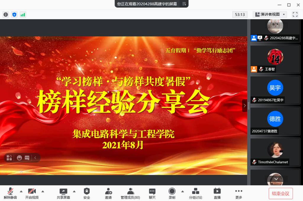 为进一步推动党史学习教育,落实“我为群众办实事”,丰富学院学生假期生活,8月8日集成电路科学与工程学院举办“学习榜样·与榜样共度暑假”榜样经验线上分享交流会,学院师生80余人参加此次活动。