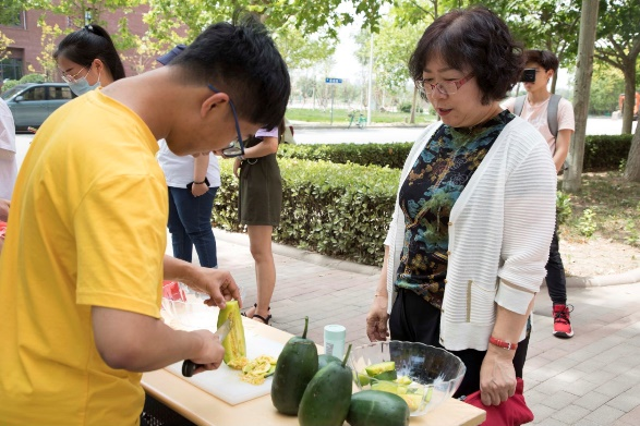 各学院的师生闻讯纷纷到来,现场人山人海,众多学生党员和负责学生协助瓜农,热情地为到场师生介绍甜瓜的种类、价格和营养价值,并组织广大师生有序进行甜瓜的试吃与购买。前来选购的老师同学在进行试吃之后赞不绝口,大家表示,东杜庄村带来的甜瓜色泽圆润饱满,口感鲜嫩香甜,温润多汁,如含着蜜汁一般,绵柔的瓜肉仿佛在舌尖上跳舞,吃起来刚刚好,让人根本停不下来。不到半个小时,400余斤甜瓜就已销售一空。