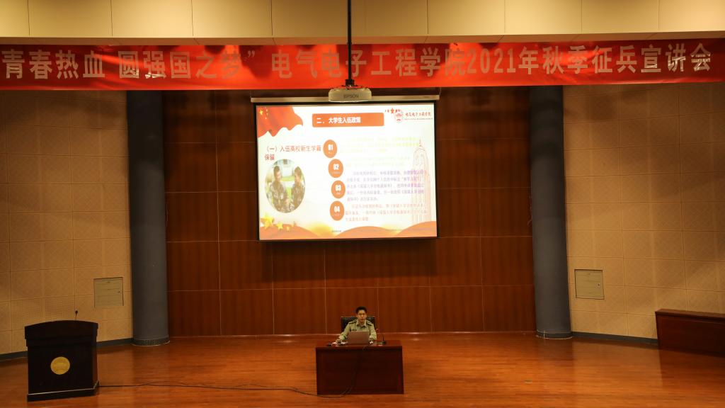为深入贯彻习近平强军思想,激发青年学子坚定理想信念、站稳人民立场、练就过硬本领、投身强国伟业的昂扬斗志,推动2021年大学生征兵工作顺利开展,5月11日,电气电子工程学院于环安报告厅举办了主题为“燃青春热血,圆强国之梦”的征兵宣讲活动,师生代表共计300余人参加。