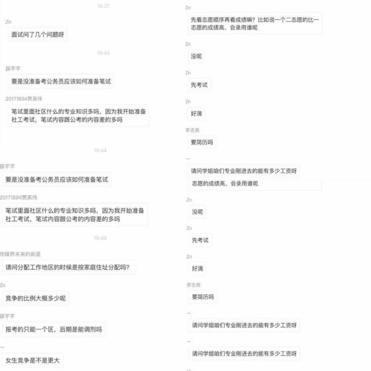 分享过程中,管理学院2016级学生柳思雨表示组织社区工作者报考经验分享会是一场及时雨,可以为毕业生充分做好就业择业规划、了解社区工作提供有效参考。学姐对社区工作及其人员组成和分配等等进行了简单的介绍,并和同学们探讨了社区未来的发展。李浦芮针对组织计划类、人际沟通类、应急应变类、综合分析类面试题型进行了充分分析,并为参会同学讲解了天津市关于高校毕业生社区工作者报考相关政策,对于目前未签订就业协议同学如何结合自身实际树立正确社区工作观也进行了详细指导。