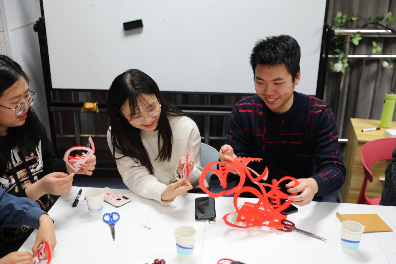 大家在“信任互拍”“答词抢词”的活动中放松身心,并回顾各自一年来的工作收获和感动瞬间。两节临近,大家一起剪窗花、写福字,互赠祝福,预祝新春。虽然很多老师没有剪纸的基础,但是在伙伴们的鼓励下全情投入,小小红纸,方寸之地,尽显风采。不一会,一个又一个生动活泼的剪纸作品不断展现。老师们纷纷表示:“自己许久都没有体会到如此放松和温馨的感觉,谢谢学校的精心组织,为大家举办这样暖心的活动”。