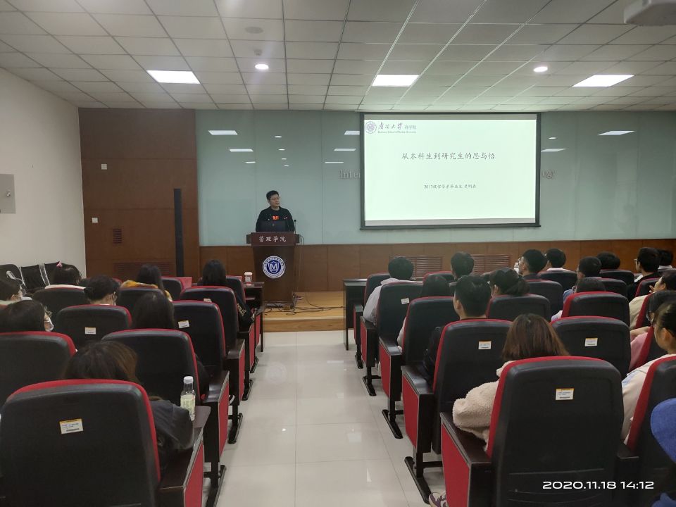 校友楚明森,目前南开大学博士在读。他做了题为“从本科生到研究生的思与悟”的讲座,他告诉同学们要深刻了解自己所需,把握内心后再进行未来选择。同时,他谈到了本科和研究生阶段进行科研时的感悟,通过科研,他更加清晰地认识了自己,意识到保持阅读和积极讨论请教的重要性。