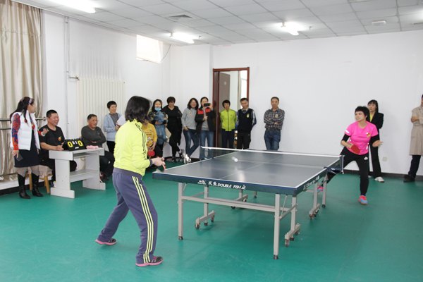 乒乓球团体赛中,每队四人按男单,女单,男女混双项目进行比赛,实行淘汰制,三局两胜。比赛特意邀请体育部资深乒乓球教练崔健老师担当裁判。馆员们神情专注,敢打敢拼,一次次发球、推挡、削球和扣杀使比赛精彩纷呈、高潮迭起,引得观众阵阵喝彩。