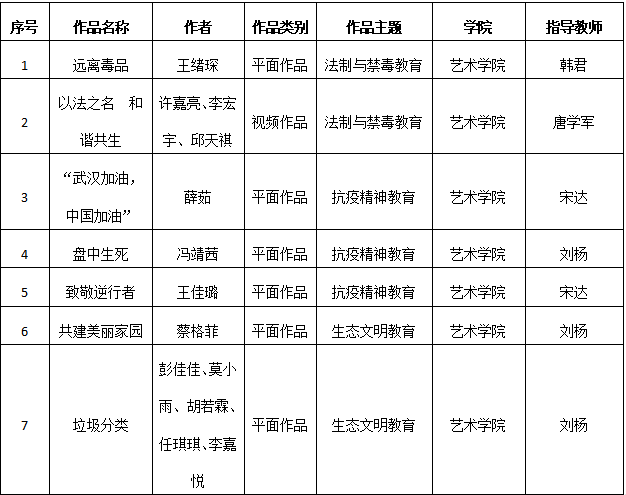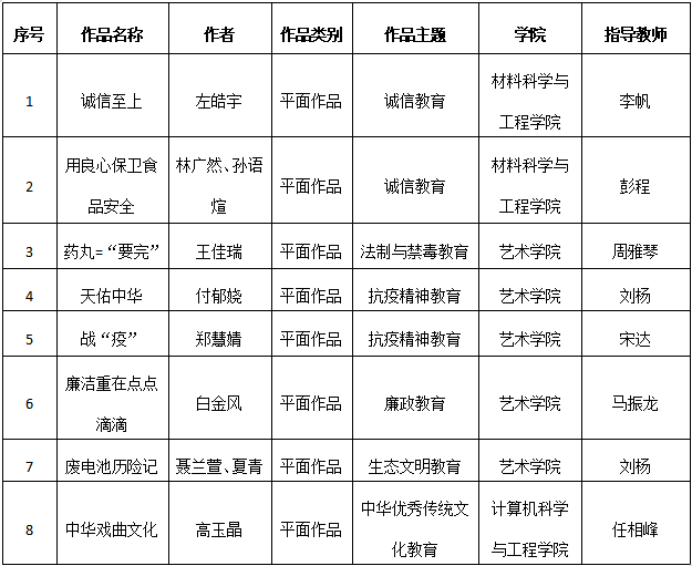 为深入学习宣传习近平新时代中国特色社会主义思想,贯彻落实全国教育大会精神、全国高校思想政治工作会议精神,进一步推动社会主义核心价值观和中国梦宣传教育活动走向深入,广泛宣传抗击新冠疫情期间涌现的奉献精神、感人事迹,提高学生的创新意识和创造能力,培养担当民族复兴大任的时代新人,市委教育工委、市教委举办了2020年天津市大中小学生“弘扬抗疫精神 厚植爱国情怀”公益广告设计大赛。我校积极组织学生报名参加,经专家评委评审,我校被评为优秀组织单位,21组作品获奖,其中2组作品荣获一等奖,8组作品荣获二等奖,7组作品荣获三等奖,4组作品获优秀奖,韩君、郭增玉两位老师获得优秀指导教师。