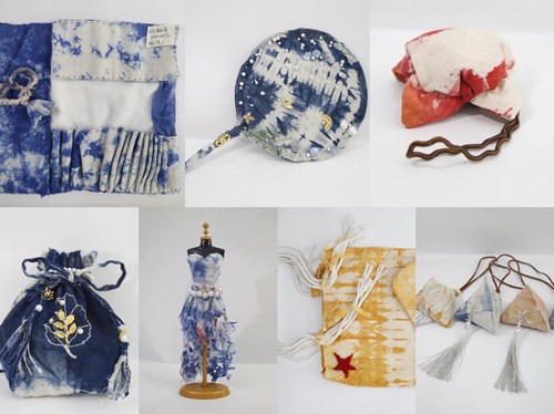 参赛同学利用扎染传统技法将布匹融合染料,设计出形态各异的印花,经过二次剪裁、缝制、设计,制作出一件件展现民族文化特色与生活创意的艺术品,共征集作品101件。作品《和合》,采用大面积的云朵扎染加上云朵的点缀,将咫尺天涯的不可能定格在笔袋上,交融相合,寓意“各美其美,美人之美,美美与共,天下大同。”;作品《团扇》,以靛蓝为基调,条纹染为手法,废旧衣架为框架,传统团扇为式样,加珍珠、金饰、满天星为点缀,将传统扎染与现代饰品相碰撞,赋予了团扇新的形象;作品《丹若香包》,布料扎染的纹理是两个同心圆,代表着五十六个民族团结一心,丹若是石榴的雅称,将香包制作成石榴的样子也象征了各民族像石榴籽一样紧紧相拥,齐心奋进。优秀的参赛作品兼具实用性与创造性,充分展现出当代大学生对于传统文化的理解和对现代生活的表达。
