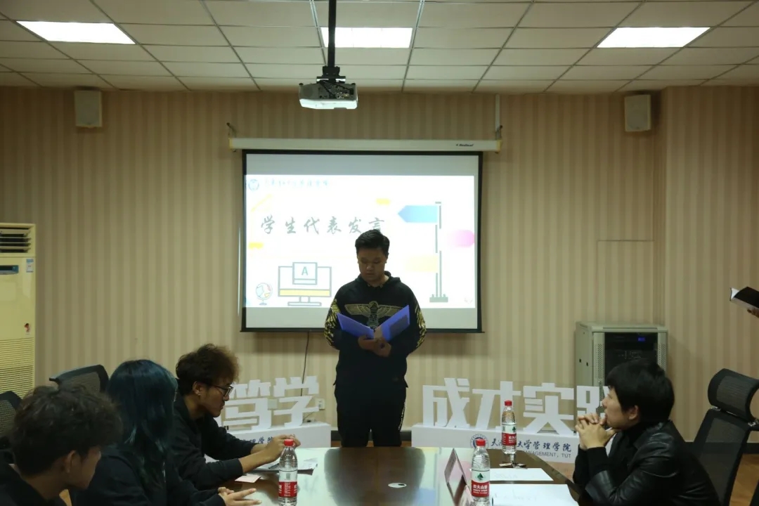随后,班级学生代表一一交流分享了自身对于未来的学业规划,不仅给其他仍身处迷茫的同学们树立了榜样,也增进了导师对于同学们的了解。在学生代表的引领下,其他同学们也纷纷指出了自己迷茫的原因,导师们也为各位同学答疑解惑,帮助同学们明确目标、树立信心、坚定信念。在师生问答环节后,管理学院学风建设中心特别制作了“班级展望树”和“时光宝盒”,以传达学院领导老师对班级工作的鼎力支持和对同学们的美好祝愿。由老师和同学们将自身对于班级的希冀共同汇聚在展望树之上,同学们又将自己所立下的短期目标放置到时光宝盒之中,让班主任老师与同学们在未来的某个时刻打开盒子,共同回望今日,一起见证大家的成长印记。班主任党玉婷老师对前期的班级建设以及未来班级展望给予了高度肯定和期待,并呼吁全体同学在未来的人生道路上能够继往开来、砥砺前行。