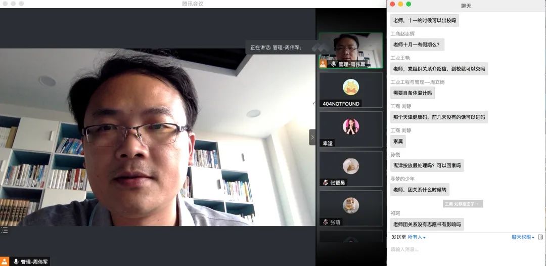 各专业辅导员统一着装,分不同时段与天理管院2020新生及家长开展视频会议。老师们主要从报到前准备、现场报到流程、宿舍入住手续、开学初具体安排等事项向新生和家长进行全面介绍。此外,准确传达学校在疫情防控方面的具体要求,细致讲解迎新安排中的环节,最大限度地争取新生及家长们的理解,为新生报到入学提供热情周到的服务。在交流中辅导员特别提示,来自低风险地区的新生及家长入校前展示“绿码”,来自中高风险地区新生及家长入校前提供七日内核酸检测报告,切实织密扎牢疫情防控的监督网。最后,师生家长就共同关注的问题进行沟通交流。