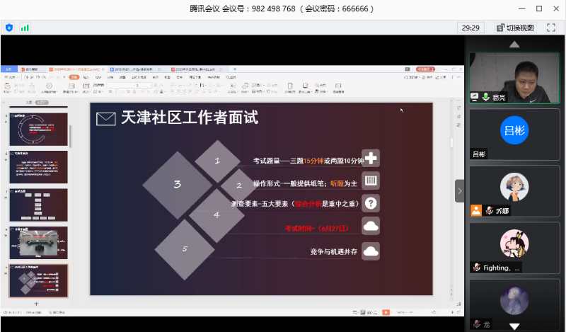 本次线上指导课通过校友资源邀请到葛亮老师,课程时长达3小时,葛老师从面试的考情概述、现场真题演练、综合备考指导、考场注意事项四个方面,详细的介绍了面试者心态准备、礼仪着装、答题技巧等备战方法,还结合多年工作经验和当下线上招聘的大背景,以具体面试题为例,通过线上互动答题、互动答疑,剖析社区工作者考试面试过程中的侧重点、得分点,多角度、深层次的讲解让毕业生们受益匪浅。