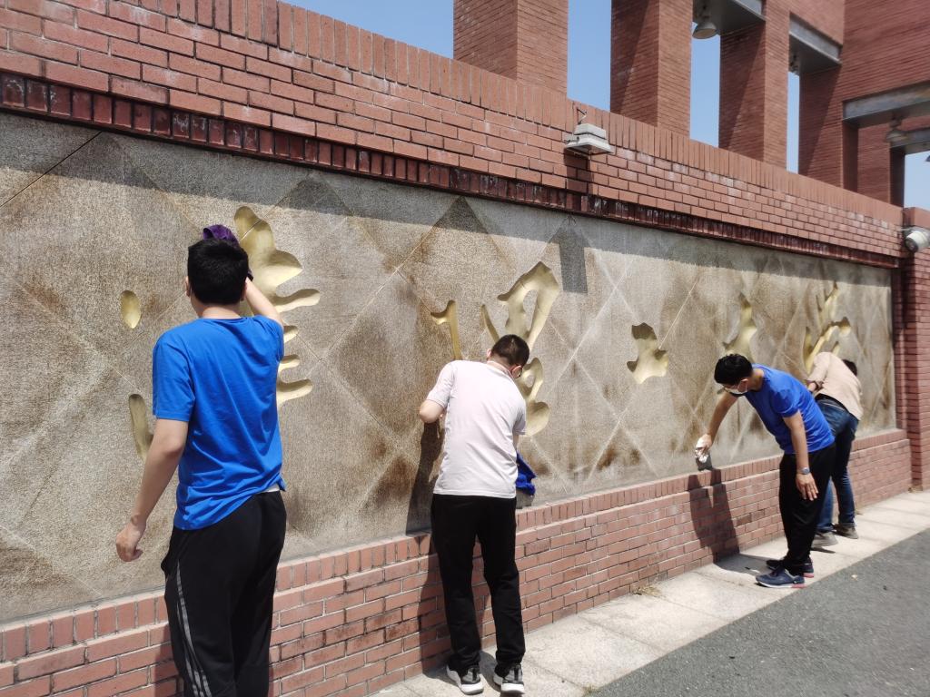 活动伊始,党支部书记向所有党员介绍了此次活动的意义,并为同学们讲解了学校校训的含义。随后各位同志两人一组,主动承包责任区,用抹布细致擦拭学校南门的校名石碑与校训石碑,并认真清理了现场的遗留垃圾废物。在清理过程中,各位同志既体会了劳动的辛苦,更是对校园的清洁工作人员表达了尊重与感谢;与此同时,在劳动过程中也在细细感受校园的美丽,发现体会天理之美。清理过后,30余名支部党员同志在校训石碑前进行了集体宣誓,表达了对学校的感恩与感激,同时也立志谨遵校训“重德重能求实求新”,在天理沃土上茁壮成长,惜时如金,增长本领,磨砺品质,为学校发展贡献青春力量,为祖国建设添砖加瓦。