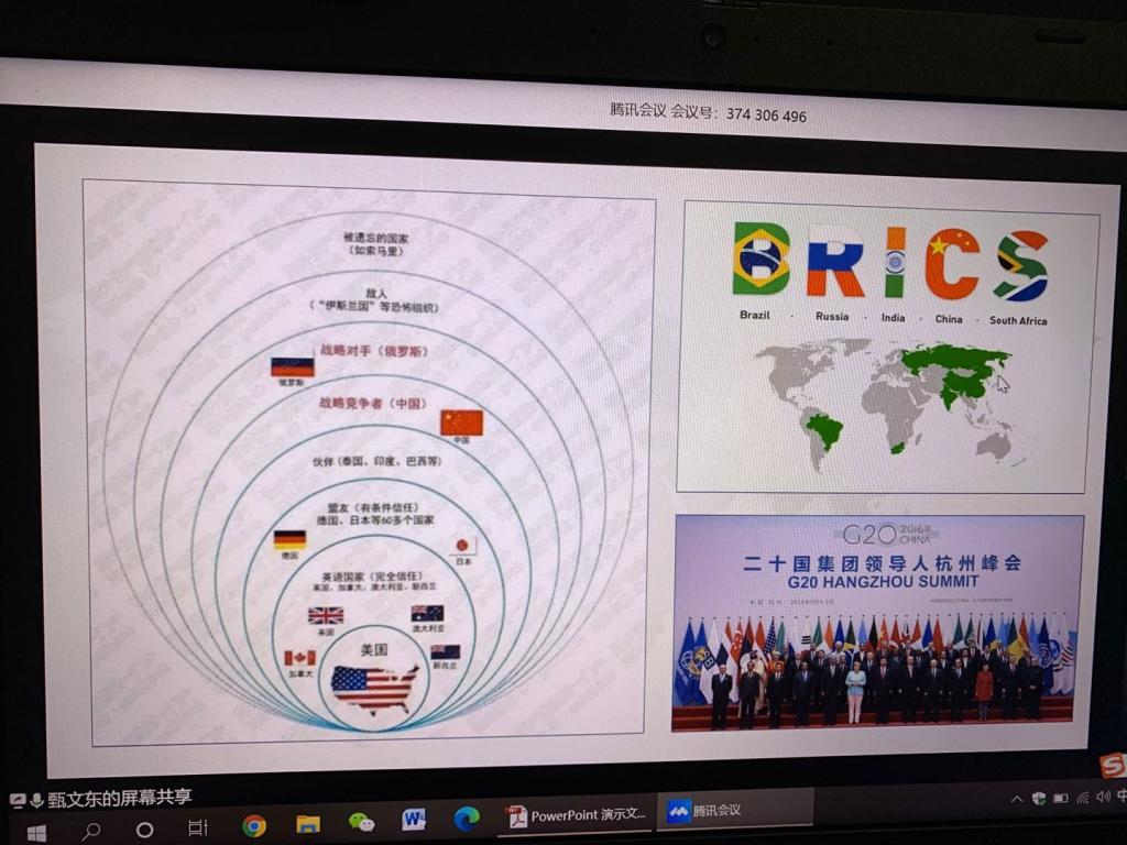 新冠疫情的发生对中国以及世界都产生了巨大的冲击,对国际格局、中美关系、人类命运共同体的构建等都产生了深远影响。学院此次学术沙龙围绕新冠疫情下的中国与世界的变化展开讨论。甄文东老师以“当前国际格局的演变及主要热点问题发展态势”为题、孔祥润老师以“新冠疫情下共同体的张力”为题、张树明老师以“新冠疫情下特朗普政府对华政策实质与中美关系发展趋势”为题、董志敏老师以“新冠疫情影响下的世界经济与中国对策”为题分别做了主题发言。沙龙紧密结合习近平新时代中国特色社会主义思想,特别是以习近平有关人类命运共同体的论述为指导,既是一次内容丰盛的学术沙龙,也是一次教学相长的集体备课会。