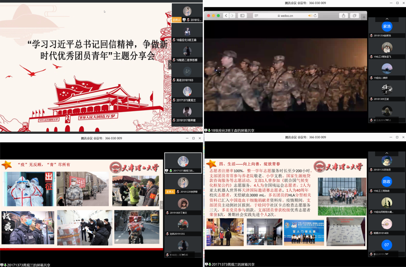 会议伊始,全体参会人员集体学习了习近平总书记给北京大学援鄂医疗队全体“90后”党员回信精神,并结合五四运动的历史背景和抗疫一线青年故事,在主持人的讲解下,同学们进一步增强了对五四运动精神的理解,表示要不负韶华、不惧风雨、勇挑重担,不辜负总书记的殷切期盼,以实际行动践行初心使命。随后,邀请了学校优秀团干部标兵、五四红旗团支部书记黄观兰同学进行分享,她分别从学习生活、支部工作、抗疫志愿服务等方面进行了详细介绍,讲述了一名优秀共青团员的成长经历,阐述了新时代青年的使命担当。