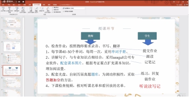 轮机工程系韩佳颖老师所授课程为轮机英语和口语类课程,韩老师通过实践发现课前准备部分的资料文档对在线上教学效果较好,包括电子教材、音频材料、单词手册、图片资料等,此外,韩老师还介绍了自己的授课流程,并分析了在线教学优势劣势。