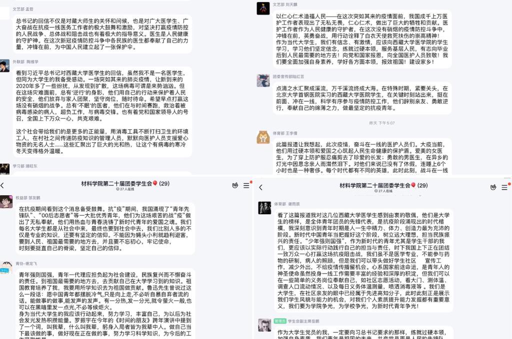 据悉,材料学院将继续开展线上交流研讨活动,引导全院学生深入学习领悟习近平总书记对防疫工作的各项指示,在举国上下抗击疫情的关键时刻,把总书记的真挚嘱托内化于心、外化于行,奉献自己的青春力量,练就过硬本领造福人民群众,肩负起新时代青年应有的使命和担当。
