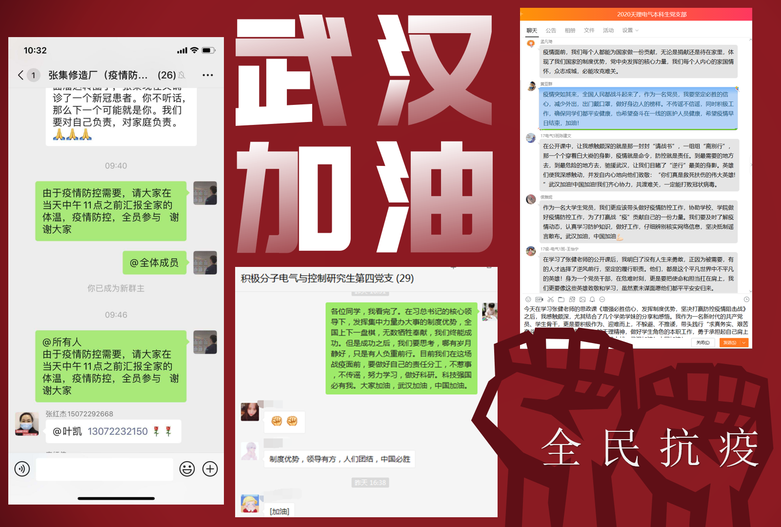 面对新型冠状病毒感染的肺炎疫情,电气电子工程学院各学生党支部积极作为,组织学生党员、入党积极分子建立联动机制,形成网格化管理模式,协助学院摸排学生状况、构建信息反馈渠道,掌握精准信息,用实际行动全力落实各项防控措施。同时,各学生党支部以疫情防控作为爱国主义教育鲜活教材,充分发挥网络平台作用,开展特色党日活动,引领广大同学筑牢抗疫防线,坚定信心、齐心协力、共克时艰。