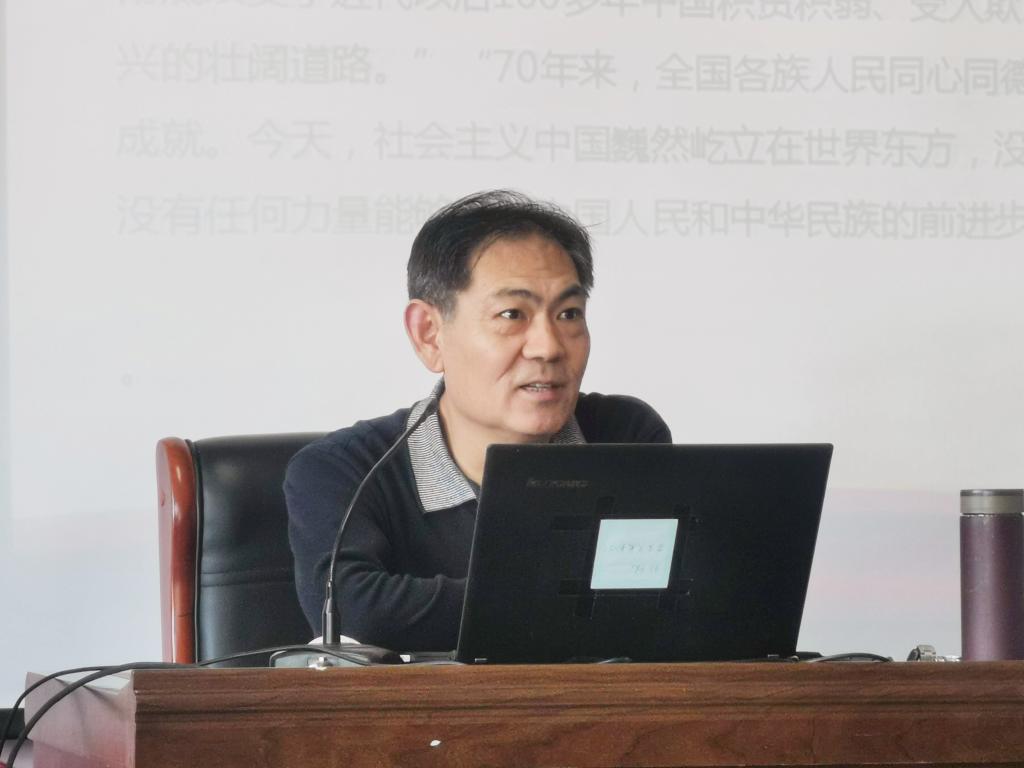于景明书记做了题为“学习党史国史—不忘初心、牢记使命”的主题报告。报告以习近平总书记在庆祝中华人民共和国成立七十周年大会上的重要讲话开篇,带领同学们回顾了70年来全国各族人民同心同德、艰苦奋斗所取得的令世界刮目相看的伟大成就。紧接着,于书记讲述了自1840年以来无数仁人志士为谋求民族独立所进行的艰辛探索和英勇斗争,介绍了我们党为实现人民解放、民族复兴不忘初心、牢记使命所进行的伟大革命,伟大斗争。最后,于书记向入党积极分子们提出了几点要求,一是要牢固树立“四个意识”,二是要坚定“四个自信”,三是要坚决做到“两个维护”,努力成为德智体美劳全面发展的社会主义建设者和接班人。