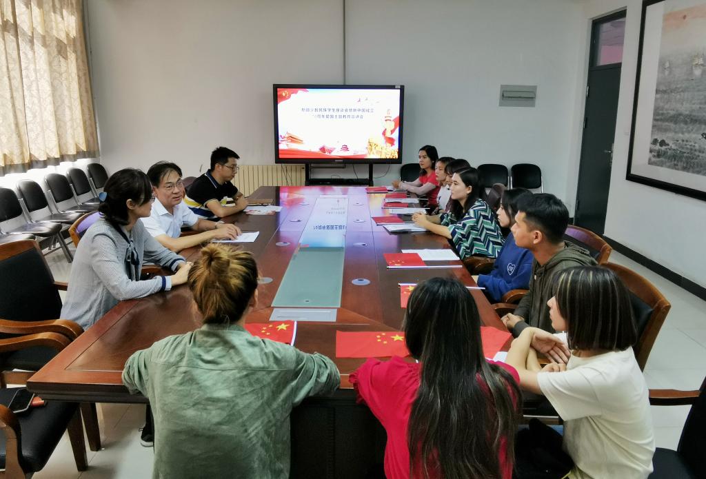为进一步加强少数民族学生国家观教育、民族团结教育,厚植爱国主义情怀,外国语学院于9月18日举办少数民族学生座谈会暨新中国成立70周年爱国主义教育宣讲会,学院有关负责人及10名新疆少数民族学生参加了此次座谈会。
