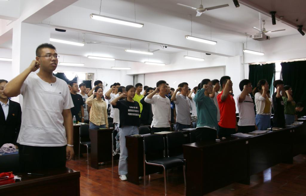 仪式上,2019级团员代表朱倩怡同学在国旗下演讲,她结合军训感受分享了她作为一名青年对爱国主义与奋斗精神的理解,并表达了新时代青年继承和发扬五四精神,勇担使命、奋发向前的决心。随后,老师为新生团员代表佩戴团徽,在场团员一同重温入团誓词,深刻理解团员的使命与担当。