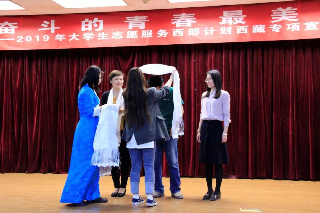 宣讲结束后,宣讲团成员耐心地解答同学们的疑问,对西部计划志愿者的待遇补贴、政策保障、考核奖励等方面进行了全面解读,帮助同学们进一步了解西藏、了解西部计划。西藏自治区团那曲市委副书记何晓娟为参会教师献上了洁白的哈达。