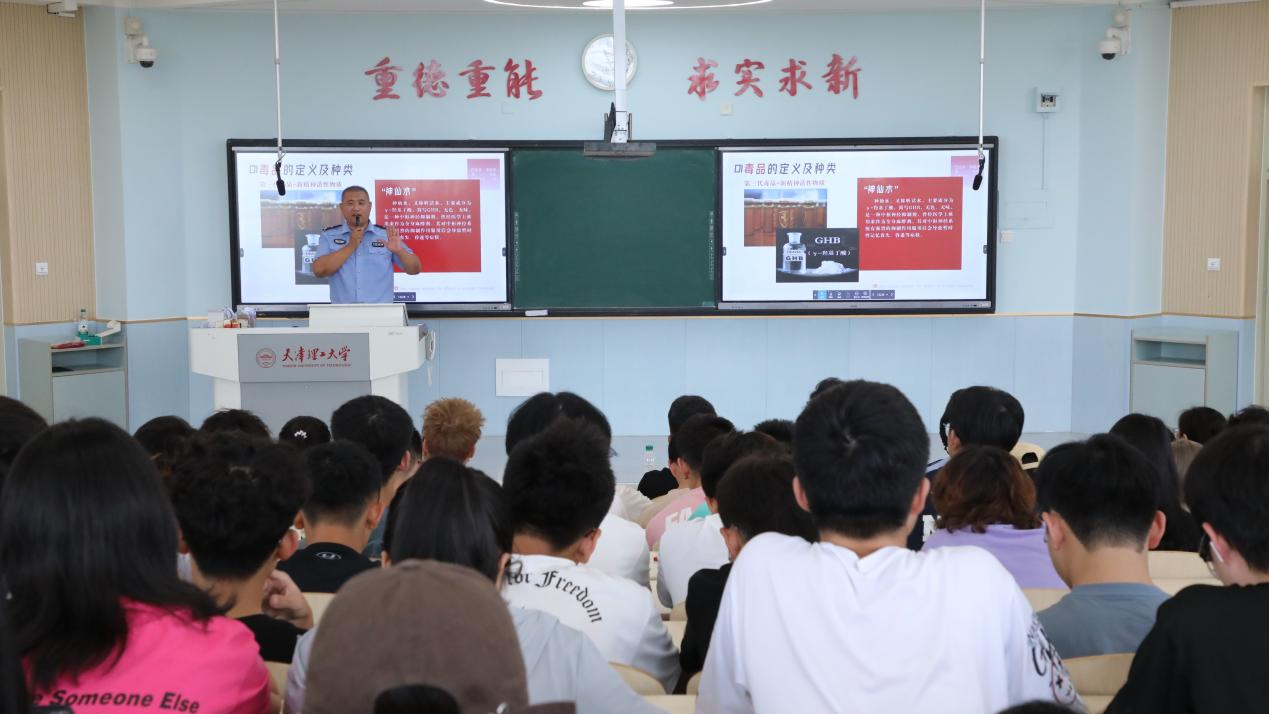 天津市戒毒局蒲公英宣讲团成员邵伟峰结合生动案例,对来自各学院的200名师生详细讲解了毒品的类型、吸食毒品的危害,引导广大学生树立正确的价值观,自觉远离药物毒品,提升自我保护技能,拥抱积极人生。