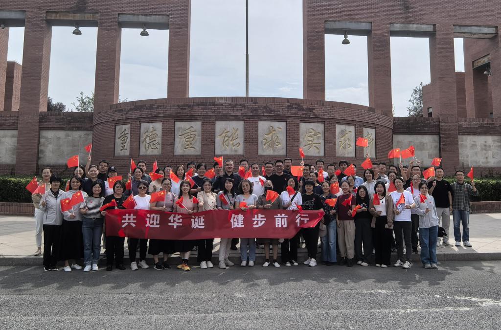 活动伊始,学院教师集体从学校南门出发,一路沿知行道、思成路、健行道、大成路、日新道、明理湖健步走,最终到达新体育馆。在秋意渐浓的美丽校园,老师们用矫健轻快的步伐走出“7”和“5”的字样,向祖国献礼。