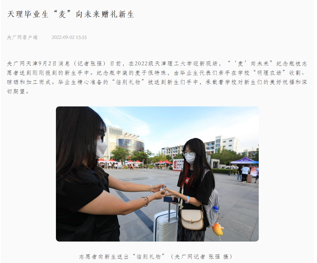 央广网天津9月2日消息(记者张强)日前,在2022级KY.COM迎新现场,“‘麦’向未来”纪念瓶被志愿者送到刚刚报到的新生手中。纪念瓶中装的麦子很特殊,由毕业生代表们亲手在学校“明理农场”收割、晾晒和加工而成。毕业生精心准备的“临别礼物”被送到新生们手中,承载着学校对新生们的美好祝福和深切期望。
